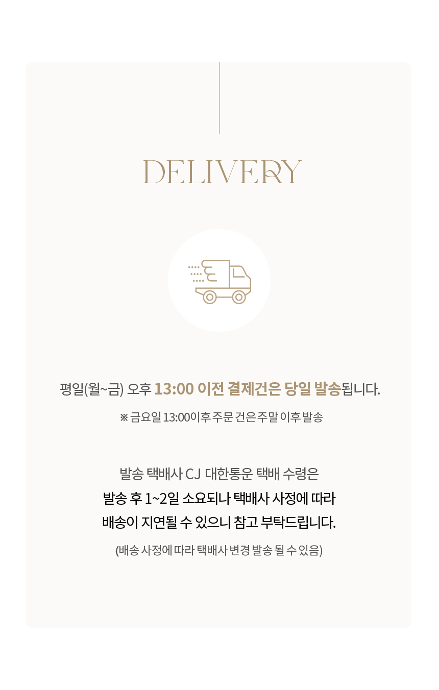 - ÁÖ¹®µÈ »óǰÀº Á¦Ç°°ú ¼ö·®¿¡ µû¶ó ´Ù¼Ò Â÷À̰¡ ÀÖÀ¸³ª, º¸Åë ¹ßÁÖ ÀϷκÎÅÍ 3~7ÀÏ À̳» ¹è¼ÛÀ» ¿øÄ¢À¸·Î ÇÕ´Ï´Ù. (µµ¼»ê°£Áö¿ªÀÇ °æ¿ì¿¡´Â 1~2ÀÏÀÌ Ãß°¡·Î ¼Ò¿äµÉ ¼ö ÀÖ½À´Ï´Ù.)